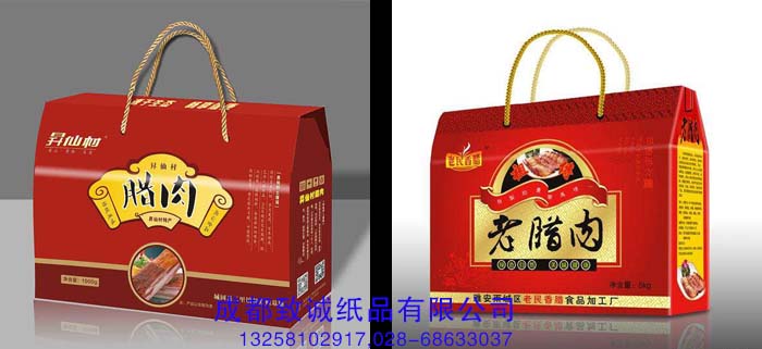 成都致誠(chéng)紙品有限公司為客戶定制了一款【香腸/臘肉包裝盒】,包裝盒材質(zhì)選用白板紙裱瓦楞紙,印刷主色調(diào)為紅色,體現(xiàn)出中國(guó)傳統(tǒng)節(jié)日的喜慶,正面方上臘肉的圖案,吸引消費(fèi)者的視線,成為傳達(dá)商品信息,在左上角放上公司的logo,工藝制作覆膜,燙金,穿三股繩,稱重為5-10斤。